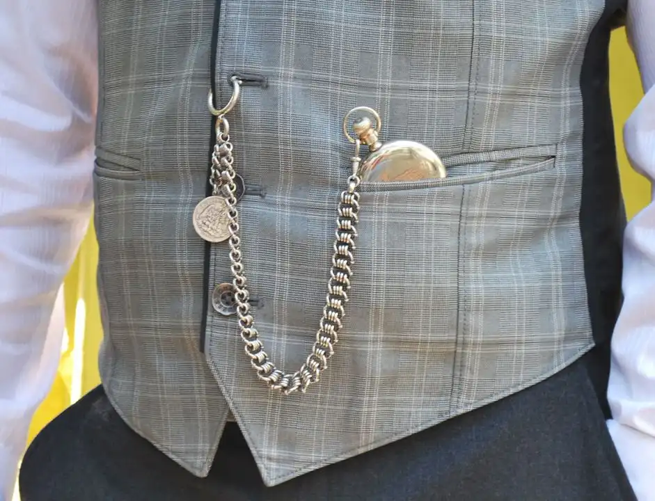 Another common way to carry your pocket watch is via the front pocket of your vest. These pockets tend to be a bit smaller than found on the jeans & pants pockets, and we suggest a watch no larger than 16S.