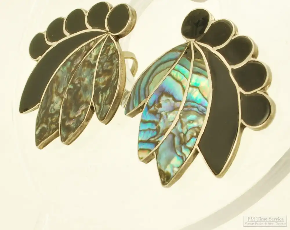Vintage ETM Sterling silver, onyx & nacre flower-motif screw-back earrings, Sterling silver earring base in the shape of large flowers have been accented with smooth inserts of black onyx and multi-colored iridescent nacre (mother of pearl) in shades of blue, green, pink, grey and brown, standard screw-back earring settings with flower-engraving on the screw back, back of each earring is stamped "ETM Sterling 925 Taxco" and "Mexico", earrings are showing normal even wear, it should be noted that while the earrings are clearly a matched set in design, the nacre inserts are slightly different in color and pattern, measures approx. 30mm wide x 32mm tall x 13mm thick (closed). A high quality and eye-catching vintage earring set in excellent condition!