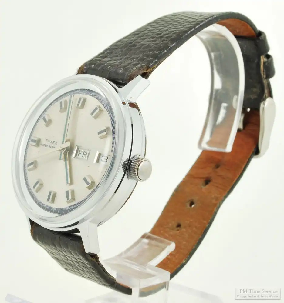 Timex 0J wrist watch with day & date, vintage mechanical manual-wind movement, silver-toned metal dial with a sunburst brushed finish, raised silver markers with blue enamel accents, a blue outer ring with white minute and seconds markers and day & date apertures bordered in white at 3 o'clock, both displays have black Arabic numbers or letters on a white background, dial has some small spots of discoloration and a few short scratches, bold silver steel baton style hands with blue enamel inserts and a silver sweep second hand, heavy smooth polish white base metal (WBM) chrome & stainless steel (SS) round case with a narrow bezel supporting a slightly domed plastic crystal and classic faceted tapered extended lugs, case is showing normal even wear overall with a small bit of discoloration starting on the lugs and crown, measures approx. 35mm diameter x 39mm lug to lug x 11mm thick (crystal included), heavily textured black leather strap band. A very nice looking vintage Timex from the 1970s in excellent+ overall condition!